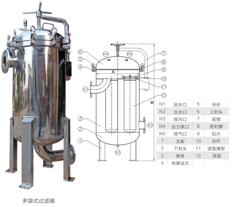 袋式過濾器是常見的水處理設備,和精密過濾器性質差不多,我公司專業生產袋式過濾器,我公司生產的袋式過濾器結構新穎、體積小、操作簡便靈活、節能、高效、密閉工作、適用性強的多用途過濾設備,過濾器殼體內部由金屬網籃支撐濾袋,液體由入口流進,經濾袋過濾后從出口流出,雜質則被攔截在濾袋中。濾袋可更換或清洗后繼續使用。
